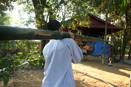 Cây tre già làm nêu năm nay rất đẹp và nặng, dài gần 20m